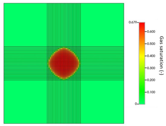 In every simulation, the perforations of the injector well, which was placed at the center of the model, were open in the 1510–1518 m depth interval. The well radius was equal to 0.0762 m, while the rate of injected CO2 was constant and equal to 200,000 sm3/day, which is equivalent to a mass rate of 0.136 Mt/y. The duration of the injection was 120 days so that the CO2 plume did not reach the model boundary over the entire simulation period (Figure 3). The same simulation strategy was adopted in Eclipse 100 and in Rubis.