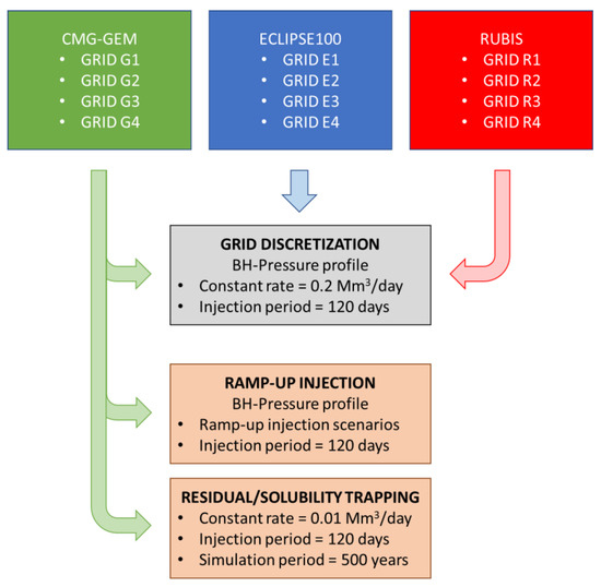 Mineral trapping was not accounted for because of its negligible contribution to the total amount of CO2 trapped in the considered time frame [48]. The different scenarios are summarized in Figure 4.