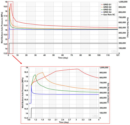 Well bottom-hole pressure profiles for grids G1, G2, G3, and G4.