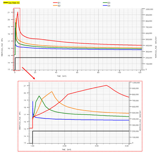 The same pressure trends observed with GEM were confirmed by the Eclipse100 simulation results, even though the values of the overpressure peaks were different (Table 5 and Figure 6). Furthermore, the reservoir pressure reached at the end of injection, ranging from 104.6% (E4) to 108.7% (E1), also showed significant dependency on the gridding.