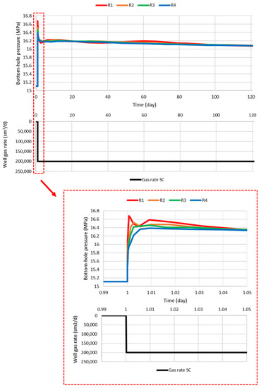 Well bottom-hole pressure profiles for the grids R1, R2, R3, and R4.