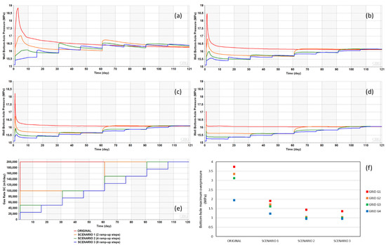 Well bottom-hole pressure profiles for the grids (a) G1, (b) G2, (c) G3, and (d) G4 for ramp-up injection scenarios 1, 2, and 3; (e) well gas rate SC for ramp-up injection scenarios 1, 2, 3; (f) well bottom-hole maximum overpressure for the grids G1, G2, G3, and G4 for ramp-up injection scenarios 1, 2, and 3.