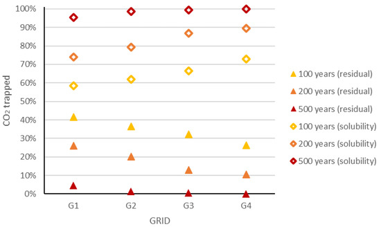 As expected, stratigraphic/hydrodynamic trapping does not depend on gridding, whereas mineral trapping does not concur to constrain the CO2 underground in the short term. However, given that only a small volume of CO2 was injected into the aquifer, in our simulations all the CO2 was either dissolved into the water or trapped by capillary forces some 100 years after injection. The results showed that the model discretization strongly affects the solubility trapping and, consequently, the residual trapping of the CO2. A different trend is observed between these trapping mechanisms (Figure 9). The CO2 immobilized by residual trapping decreases from the coarse grid to the fine grid (i.e., from G1 to G4), while an opposite trend is observed for solubility trapping. This translates into an average of a 15% discrepancy between the trapped CO2 by both residual and solubility trapping for the monitoring periods of 100 and 200 years. After 500 years of simulation, the CO2 was almost completely dissolved into the brine for all the simulated grids, except for G1 in which 5% of the CO2 remained trapped by capillary forces. This is due to the supercritical CO2–formation water interface surface, which is larger in fine grids compared to coarse grids; as supercritical CO2 dissolves into the aqueous phase only at the CO2–water interface, the solubility trapping of CO2 is strongly dependent on the extension of this interface [48]. The higher the amount of CO2 dissolved into the formation water, the lower the CO2 which remains trapped as a supercritical phase by residual trapping.