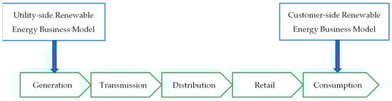 The energy sector mainly uses two general energy business models, namely, utility-side renewable energy business models (UREBM) and customer-side renewable energy business models (CREBM) [2]. UREBM constitute large-scale capacity projects that generate bulk electricity and feed it into the grid, which delivers it to customers via the conventional power system. Thus, the generation and transmission of the electricity from the RES follows a similar pattern to the centralised conventional power plants [2]. CREBM constitute small-scale systems that are installed close to the end-users, referred to as distributed generation (DG). Small-scale electricity generation systems, however, have a different integration position in the power system, that is, they are located at the consumption position. Thus, the generation and transmission of the electricity follows a very different pattern from the utility-side projects, as shown in Figure 1 [2]. Since the emphasis of this study is on distributed generation, UREBM are not discussed in this study. Interested readers may refer to [2,5] for an extended discussion about UREBM and how they compare with CREBM.