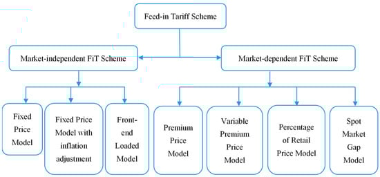 FiT schemes can be categorised into two groups. The first FiT category is the market-independent FiT scheme, where remuneration is determined by the regulatory authority independently of the electricity market retail rate. The market-independent FiT scheme is also known as the fixed-price FiT scheme. The second FiT category is the market-dependent FiT scheme, in which a premium payment, which serves as a top-up, is added to the electricity market retail rate. The market-dependent FiT scheme is also known as the premium-price FiT scheme [61,69]. Figure 2 shows the two categories of feed-in payment design, including further subdivision categories [69]. Table 3 shows a brief description of the FiT scheme models.