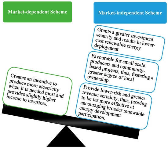 Overall, market-independent fixed price FiT schemes are currently the most widely utilised of all the FiT scheme designs. Globally, market-independent fixed price FiT schemes have been used in over 50 countries. Based on these countries’ experiences, in terms of cost efficiency of the Fit schemes, market-independent fixed price FiT payments have exhibited a higher level of cost efficiency in comparison to the market-dependent premium price FiT payments [69,71]. Figure 3 shows a comparison of the FiT payment schemes, depicting the strength of the market-independent schemes over the market-dependent schemes [61,69].