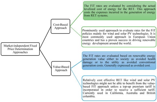 The market-independent fixed rate can be evaluated based on two approaches, namely, cost-based methods and value-based FiT calculation methods. Figure 4 shows the different approaches for determining market-independent fixed prices and how they have been used worldwide [69,71].