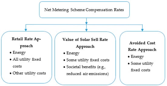 The electricity retail rate approach provides relatively high compensations compared to the other approaches of determining the compensation rates. The retail rate-based compensation rate considers all the costs incurred in generating electricity and in operating, and maintaining the grid network, as well as other utility-related expenses, while the avoided cost rate-based compensation rate primarily reflects the costs incurred in generating electricity. Avoided cost rates are usually referred to as wholesale electricity rates [80]. The value of the solar rate approach reflects more or less the same considerations as the avoided cost rate approach with an addition of the evaluated societal benefits recorded with adoption of distributed solar PV, such as the reduction in air emissions, as shown in Figure 5 [80]. Table 4 shows a brief description of the different net metering scheme compensation rate approaches.