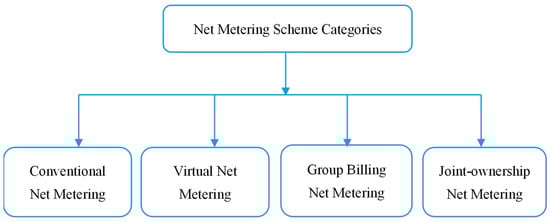 The application of the net metering scheme to energy business initiatives can be achieved by different methods. These methods are conventional net metering (CNM), virtual net metering (VNM), group billing (aggregate) net metering, and joint-ownership (remote) net metering [15,46,80], as shown in Figure 6. The conventional net metering scheme is the most frequently applied scheme for the COEB and TPOEB initiatives, while the virtual net metering, group billing net metering, and joint-ownership net metering schemes are applied to the CSEB initiatives. Table 5 shows a summarised description of the different net metering scheme categories.