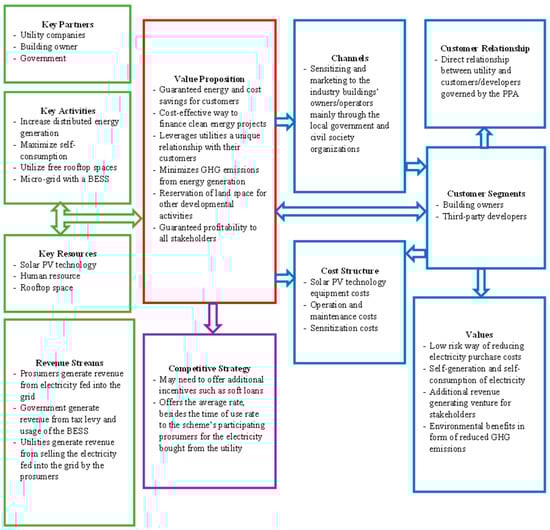 To depict the high-level strategic details appropriate for the success of an energy business initiative using the SoG scheme model, the energy business model canvas in Figure 7 was developed to depict how the energy business initiative using the SoG scheme could create and deliver value, make money, and visualise its structure. The store-on grid scheme has been investigated for its viability by consideration of the industrial sector in comparison to the time-of-use rating scheme used by the utility in Uganda [33,85]. The investigation results revealed that the industrial prosumer could record about a 12.5% decrease in the prosumer’s annual electricity purchase cost. Additionally, about 80% of the annual energy demand could be supplied by the solar PV system (which is about 84% of the annual solar PV generated energy), while only 20% is supplied by the utility [85]. Furthermore, the utility would record more profits annually by using this scheme in comparison to the currently utilised time-of-use rating scheme to bill the industrial customers. Likewise, through the scheme, both the government and prosumers would record significant revenue collection annually from generated energy sold to the utility operator [33]. Furthermore, the scheme has been compared with other billing schemes, namely, the FiT scheme and the NM scheme, to demonstrate its strength and applicability [85]. An interested reader could find more details about the SoG scheme model in [33,85].