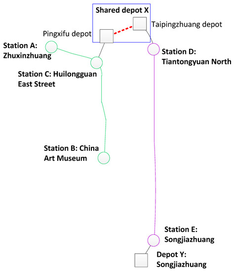 China’s urban rail transit system (URT system) develops with great demands and its construction scale keeps expanding. However, it is still dominated by single-line construction at present, which means that each line is always equipped with at least one depot to meet the parking and maintenance needs of rolling stock and represents an Electric Multiple Unit (EMU) in a URT system. The depot of an urban rail transit system usually covers a huge area in the suburban area. It is worth exploring whether the flexible utilization of urban rail transit land resources, functional resources, and rolling stock utilization [1] can be reorganized through sharing the rolling stock depot in order to improve the operation effect and reduce the operating cost.