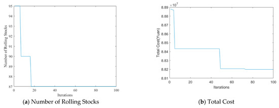In this paper, MATLAB software is used to obtain the results of the operation of two lines in the case with a shared depot. The solving procedure requires 6871 s in an Inter i5 processor with 1.6 GHz and 8 GB of RAM memory. The number of iterations is set as 100. As shown in Figure 3a, 84 rolling stocks are needed in total. Additionally, the total cost is closed to CNY 88.2 million.