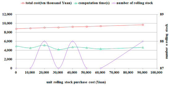 The rolling stock purchase cost can be a large part of the unit rolling stock operation daily cost, which is an important factor of total cost. In the sensitivity analysis process, the unit rolling stock purchase cost is high, which means that the operators will be more inclined to add the rolling stock connection and waiting behavior to complete the train tasks. The sensitivity analysis of the rolling stock purchase cost can be seen in Figure 5.