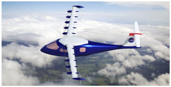 Research on distributed propulsion is undertaken in many research centers. In [4,5,6,7,8,9,10], there were presented various design concepts of this type of propulsion, trends for future projects, possible applications, and there were defined possible economic and environmental effects. Among other things, such research is carried out at an advanced level by the JOBY Aviation together with NASA. Their original project, LEAPTech (Figure 1), aims to build an aircraft, based on the Cirrus SR22 aircraft, which consumes the energy available on board more efficiently.