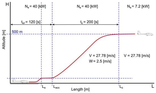 Based on the technical data of the aircraft, the flight trajectory was selected for the further research; it is presented in Figure 3. As shown in the figure, for the initial stages of the flight (take-off, climb), the time of maneuvers (tST—time of take-off, tC—time of climb), and power necessary for flight NS were indicated. The figure also has the markings of horizontal lengths corresponding to the following stages: the acceleration of the aircraft during the take-off LS, the acceleration of the aircraft in the air LACC and the climb LC. For the climb stage, there is aircraft velocity V and vertical speed W. For the last stage of the flight, which is steady flight, the power necessary for flight at the cruise speed was determined. This power will be drawn from the energy source until the energy stored on board is exhausted completely. In this way, the flight duration and range of the aircraft will be determined.
