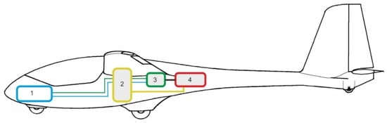 Diagram of the hybrid propulsion system with a combustion engine for the AOS motor glider airframe: 1—battery, 2—fuel tank, 3—Emrax 188 motor working as an alternator, and 4—Wankel AG 407 TGi engine.