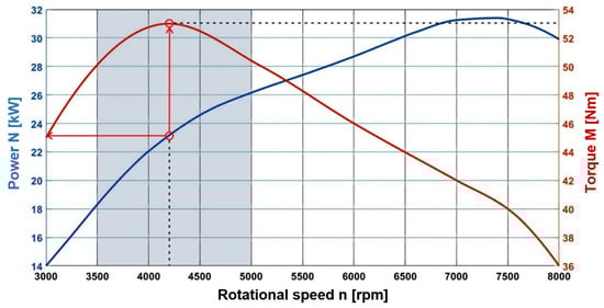 The characteristics presented in Figure 5 show that the range of engine operation with the highest values of torque (over 28 Nm) is within the range of the rotational speed of the engine shaft between 3500 rpm and 5000 rpm (which is indicated in the figure as grey area). In turn, the maximum torque (53 Nm) corresponds to the power of about 22.5–23 kW (which is indicated in the photo with red arrows). In these ranges, the engine achieves the best thermal efficiency, i.e., the ratio of the developed power at the highest torque parameters that the engine can achieve to the simultaneous lowest specific fuel consumption. At the same time, the engine instruction manual [20] states that the value of the minimum specific fuel consumption (0.3 kg/(W·h)) is achieved by the engine at the rotational speed of 4000 rpm. In this operating range of the engine, the power developed by the engine is 22 kW. Thus, this operating range of the combustion engine was adopted as the most favorable for its generator work.