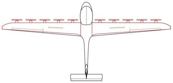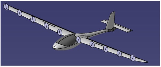 To further improve the operational parameters of the AOS H2 motor glider, based on previous works [14,15], distributed propulsion was applied to it. Based on the analyses [14,15], a set of 10 AXI 8120 electric motors with a maximum power of 4 kW each, cooperating with propellers with a diameter of 0.5 m was selected.