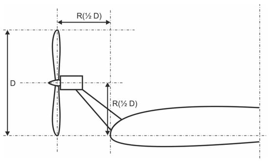 Assuming that the propellers are located at a distance equal to the propeller radius [8,19] from the leading edge (as shown in Figure 9), at this stage of the research, the propeller is treated as isolated. Any interference between the propeller and the wing is ignored [8].
