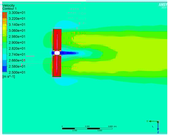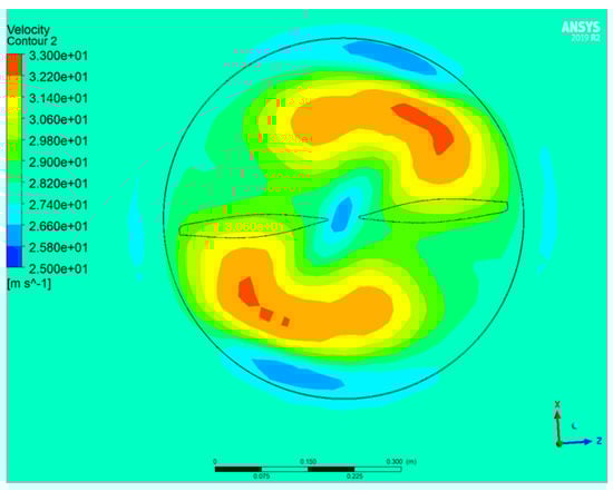As a result of the analysis, the air stream velocity distribution and pressure changes generated by the propeller were obtained. Figure 10 and Figure 11 show the velocity distributions for cruising conditions—flight speed 27.78 [m/s], at the rotational speed of the propellers equal to 90 rev/s.