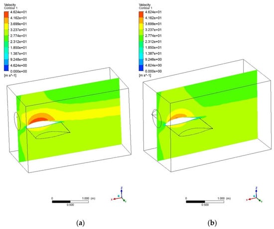 Velocity distribution of air streams flowing around the wing: (a) with the influence of the distributed propulsion, (b) without the influence of the distributed propulsion.