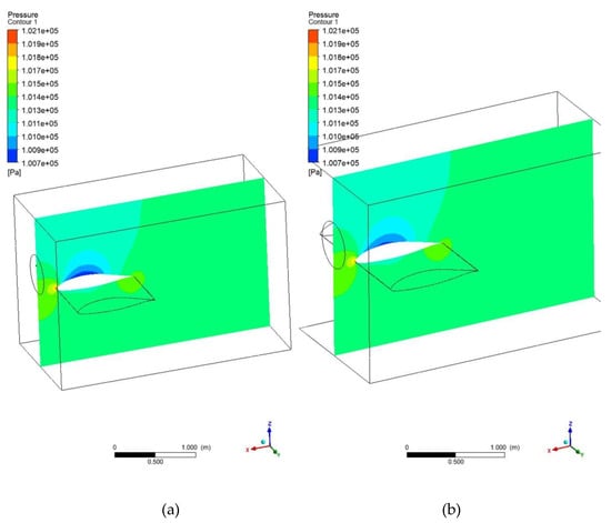 Pressure distribution of air streams flowing around the wing: (a) with the influence of the distributed propulsion, (b) without the influence of the distributed propulsion.