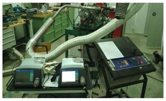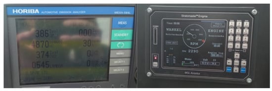 In Figure 6, the engine mounted on the test stand is shown. The test stand uses a water-cooled eddy current brake. This brake loads the reciprocating engine by generating an eddy current field. The torque is transferred to the brake housing by electromotive force. The measurement of the driving torque is performed by a strain gauge beam coupled to the housing. An optical sensor located on the brake shaft is responsible for measuring the rotational speed of the engine. The measuring system calculates the power generated by the motor taking into account the torque and rotational speed of the motor shaft. Fuel consumption is measured by weighing the fuel tank.
