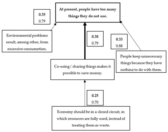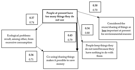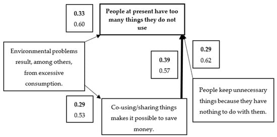 In this group, if one was positive that the economy should be circular and resources should be fully used instead of treating them as waste (5), he/she also strongly believed that reusing/sharing things enables one to save money (5). If a donating person was convinced that reusing/sharing things makes it possible to save money (5), he/she was also certain that at present people have too many things they do not use (5). Moreover, if a giving person believed strongly that people keep too many things because they do not know what to do with them (5), he/she was also positive that presently people have too many things they do not use (5). Likewise, if a “giving” person was certain that environmental problems result from excessive consumption (5), he/she also believed strongly that nowadays people have too many things they do not use (5) (results are shown at Figure 3).