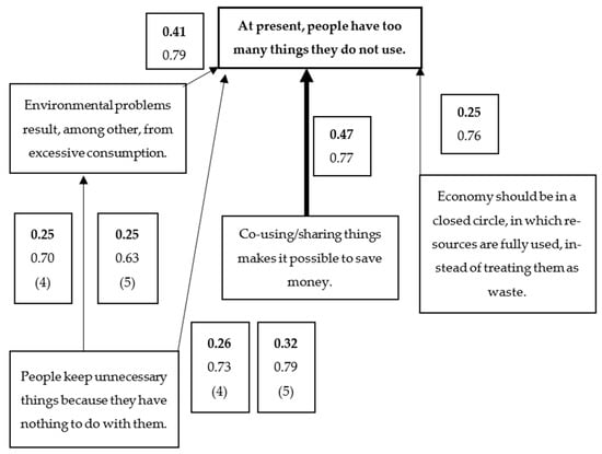 The largest group of respondents, i.e., 169 persons, would decide both: to leave useless things and take things they needed. Out of them, 20% were familiar with the concept of a freeshop, and 16 had used that solution (8 persons had given things, 2—taken, and 6—both). In total, 59% were female. In this group, the following dependencies could be observed: if a “giving and taking” person was positive that economy should be circular (5), he/she also believed strongly that at present people possess too many things they do not use (5). If one was convinced that reusing/sharing things makes it possible to save money (5), he/she was also certain that presently people have too many things they do not use (5). If a respondent believed strongly that people keep unnecessary things because they have nothing to do with them (5), he/she also thought that nowadays people have too many things they do not use (5) and that environmental problems result from, among other things, excessive consumption (5). If a “giving and taking” person was certain that environmental problems result from excessive consumption (5), he/she also believed that at present people have too many things they do not use (5) (results are shown at Figure 4).