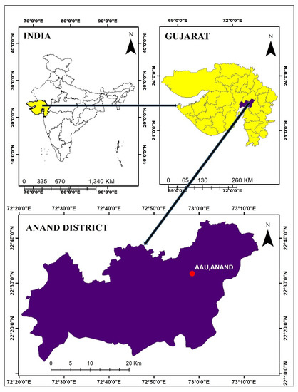 The field experiments were conducted during 2012 to 2018 in a maize–wheat cropping system at the Agronomy Farm of Anand Agricultural University, Anand, Gujarat, India, (Figure 1). The experimental site is situated at 22°35′ N latitude, 72°55′ E longitude with an elevation of 45.1 m above the mean sea level.