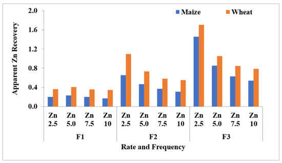 Apparent Zinc recovery as influenced by different rates and frequencies of Zn applications to maize and wheat crop.