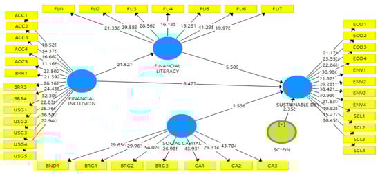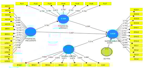 The financial inclusion measures were adapted from the study of Cámara and Tuesta [145]; it consists of access (ACC), usage (USG) and barrier (BRR), represented by 5, 5, and 4 items each, respectively. The sustainable development construct consists of social (SCL), economic (ECO), and environmental (ENV), and was measured by 4, 4, and 4 items, respectively, adopted from Atmaca et al. [96] and Chow and Chen [146]. Financial literacy (one-dimension) is adapted from Rieger [147] and Vieira et al. [148], represented by 7 items. Finally, social capital consisted of collective action (CA), bridging (BRG), bonding (BND), and trust (TRS), and was measured by 3 items, each adapted from the study of Bongomin et al. [149] and Onodugo et al. [65]. A 5-point Likert scale was used to measure the items, ranging from strongly agree (1) to strongly disagree (5).