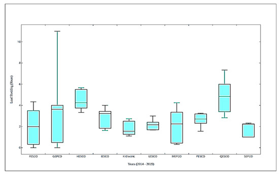 Further, inadequate capacity in the networks affects the efficient functioning of distribution companies [28]. Figure 2 shows the load-shedding hours from 2014 to 2019. It is evident that the GEPCO division shows the highest load-shedding hours. Each electricity-providing company’s daily load-shedding hours in its premises differs from others due to the power generation capacity, line losses, and priority to industrial zones. Therefore, the load-shedding intervals are different for different areas of the country.