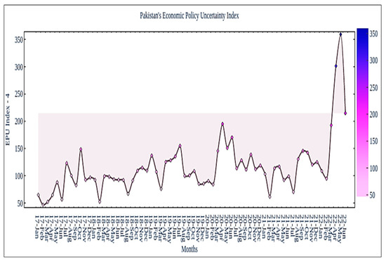Pakistan’s economic uncertainty from Jan-2017 to Jun-2022. Source https://www.policyuncertainty.com/, accessed on 11 August 2022.