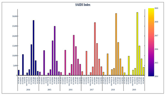 SF is the System Average Interruption Frequency Index (SAIFI), which calculates the average number of interruptions that a customer experiences in a year (Figure 5). SD is the System Average Interruption Duration Index (SAIDI), which captures the outage duration (in minutes) that the average customer experiences in a year (Figure 6). These two indexes show the severity of the outage. The values of SAIFI and SAIDI continue to fluctuate widely from one area to the next. The SAIDI index shows that MEPCO and SEPCO have higher interpretations among the distribution companies. At the same time, the SAIFI index shows a high range of SEPCO.