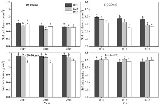 Soil bulk density for 20 cm tillage depth treatment (D20), 25 cm tillage depth treatment (D25), and 30 cm tillage depth treatment (D30) at 0–60 cm soil depth in 2017, 2018, and 2019. Note: the letters (a–f) represent the significant difference (p < 0.05) among different treatments.
