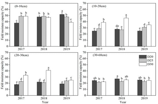 Field capacity for 20 cm tillage depth treatment (D20), 25 cm tillage depth treatment (D25), and 30 cm tillage depth treatment (D30) at 0–60 cm soil depth in 2017, 2018, and 2019. Note: the letters (a–e) represent the significant difference (p < 0.05) among different treatments.