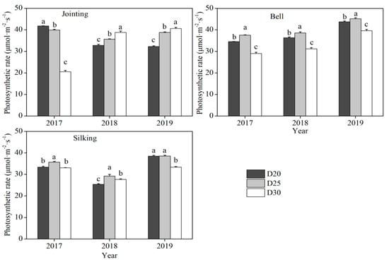 At the jointing stage, the photosynthetic rate was lowest for D30 in 2017, but it was highest in 2018 and 2019, and it was in the middle for D25 in the three treatments (Figure 4). The photosynthetic rate was between 33.2 and 42.4 umol·m−2·s−1 in the three years at the jointing stage except for D30 in 2017. At the bell stage, it was highest for D25 in the three years and lowest for D30. The photosynthetic rate was higher in 2019 than that in the other two years for each treatment. At the silking stage, it was a similar trend to that at the bell stage; however, the photosynthetic rate was lowest in 2018 in the three years. On the whole, in the three growing stages, it was lowest for the silking stage, and there was no obvious difference for the other growing stages.