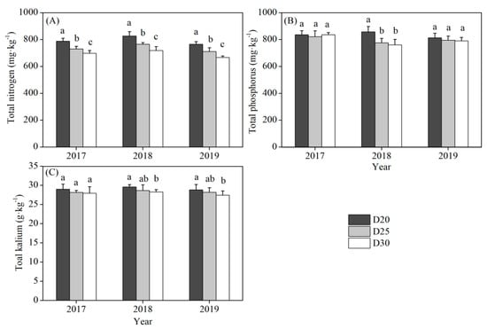 Total nitrogen (A), total phosphorus (B), and total kalium (C) in the 0–20 cm soil layers before the sowing of maize for 20 cm tillage depth treatment (D20), 25 cm tillage depth treatment (D25), and 30 cm tillage depth treatment (D30) in 2017, 2018, and 2019. Note: the letters (a–c) represent the significant difference (p < 0.05) among different treatments.