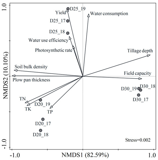 NMDS analysis was based on Bray–Curtis distance, the stress was 0.002, and the total explained variation was 92.69% (82.59% + 10.10%) (Figure 7). The results revealed that the three treatments could be divided into three groups based on tillage depth, which was obviously different from each other, and tillage depth distinctly affected field capacity, soil bulk density, plow pan thicknesses, TN, TK, and TP. Tillage depth had an obvious positive correlation with field capacity. Yields, water use efficiency, photosynthetic rate, and water consumption had an obvious positive correlation with each other which clustered together. Soil bulk density, plow pan thicknesses, TN, TK, and TP had an obvious negative correlation with tillage depth and field capacity. In addition, yields, water use efficiency, photosynthetic rate, and water consumption were higher for D25 than that for D20 and D30; soil bulk density, TN, and TK were higher for D20 than that for D25 and D30.