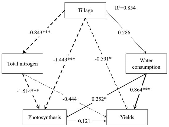 Table 4 shows hypothesis verification, the results showed that some observed variables had a significant relationship, and the hypotheses were supported (p < 0.05): tillage directly influenced total nitrogen, photosynthesis, and maize yields; total nitrogen directly influenced photosynthesis; water consumption directly influenced photosynthesis and maize yields. Some observed variables did not reach a significant relationship, and the hypotheses were not supported (p > 0.05): tillage directly influenced water consumption; photosynthesis and total nitrogen directly influenced maize yields.