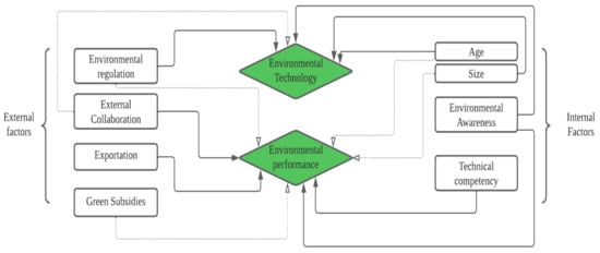 In addition to the internal factors of the firms, several works and empirical studies highlight the effect of factors related to the external environment of the firm: exportation, green subsidy and external collaboration. In a literature review, Ozusaglam [58,59] highlights barriers related to access to information as the main obstacle to the diffusion of ET and the achievement of environmental objectives. Considering that successful implementation of ET, which can lead to improved environmental performance, may require specific knowledge and also skills that do not necessarily belong to the company’s area of competence [58]. The fundamental role played by external sources of information also called external collaboration was also highlighted by Horbach et al. [23] who found in the context of German industry, the positive effect of knowledge flow on the diffusion of ET and improvement of environmental performance. Wong [27] found that the sharing of information and knowledge by actors outside the company has a positive impact on its compliance with environmental requirements. The empirical literature on the influence of a company’s international openness on ET adoption and environmental performance is not very convergent and the available results are still very mixed. For Conceição [60] in the Portuguese context, Horbach [61,62] in the German context, and Galliano and Nadel [63] in the French context, firms with a high share of production destined for export, due to their high exposure to international competition, are the most compliant with environmental requirements. This positive link is also confirmed by Triguero et al. [29] for the case of Spanish industrial and service firms. However, this positive link is challenged by Carrión-Flores and Innes [41] who found a negative link between exportation intensity and firms environmental performance.