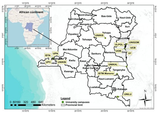 This study was conducted in the DRC (Figure 1), located in central Africa, between the parallels of 5° N to 13° S and the meridians of 12° to 32° E. The country has a surface area of 2,345,410 km2, and shares borders with the Republic of Congo to the northwest, the Central African Republic to the north, South Sudan to the northeast, Uganda, Rwanda, Burundi, and Tanzania to the east, Zambia to the southeast and Angola to the west [32]. The universities surveyed are located in the southeastern and western DRC.