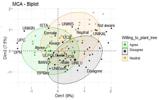 Results from a multiple correspondence analysis showing the relationship pattern between the universities, awareness of climate change, gender, and willingness to plant trees on campuses.