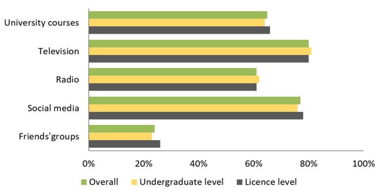 About two-thirds of students enrolled in license claimed to obtain information about climate change issues and the roles of trees from radio and university environment-related courses (Figure 4). Overall, television (80%), social media (77%), and university courses (65%) were the major sources of information used by students to learn about climate change issues and the roles of trees in the community. The sources of information affecting students’ willingness to participate in tree planting are shown in Table 5.