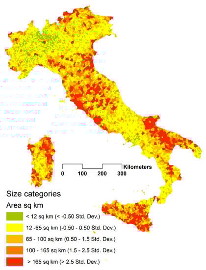 The data used in this paper refer to the latest dataset provided by ISTAT (Central Statistical Institute) in 2021 (https://www.istat.it/it/archivio/6789 (accessed on 10 February 2022)), and the classification by extension categories, therefore, refers to this data. The authors supplemented the ISTAT dataset with a substantial set of additional data made available as Supplementary Materials to this paper. In particular, the geographical dataset has been compounded by data from the ISTAT population censuses from 1861 to 2011.