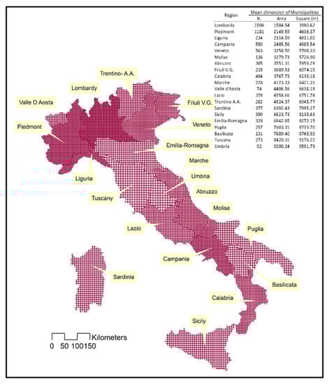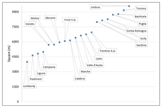 The Italian region with the smallest average size of municipalities is Lombardy, with 1584 ha (3.9 × 3.9 km), while a group of five regions fall within the national average (Veneto, Molise, Abruzzo, Friuli V.G. and Calabria). Over half the regions have larger areas, up to peak values in Tuscany and Umbria with over 8400 and up to 9200 ha (equal to squares of just under 10 km per side) (Figure 2).