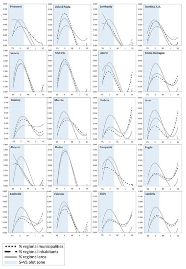 In historical terms, the prevailing small size of the municipalities in northern Italy can be attributed to their development between the mid-11th and early 12th centuries as an autonomistic push by the numerous large and small towns and rural communities against the weakened feudal power of the Emperor. This process developed in a very widespread and capillary manner, especially in northern Italy and, only later, extended to other parts of the country, which remained for a long time still characterized by feudal management, with large territories entrusted to the noble and religious classes. In southern Italy, the solidity of the Norman Kingdom did not allow for the development of forms of autonomous government that would only express themselves, on the basis of large fiefdoms, between the 12th and 14th centuries. The development of municipalities has also affected other European countries and, for example, France is characterized by the presence of very small municipalities. The size of municipalities has not changed much over time, the most recent of which date back to the era of the Fascist government and, subsequently, to very few cases of voluntary amalgamation managed directly by some administrations. Regional curves (Figure 4) show the distribution of the three rates of municipal size, population and regional surface coverage in the five categories VS, S, M, L and VR processed by means of the classification obtained through the clustering procedure described in Figure 1.