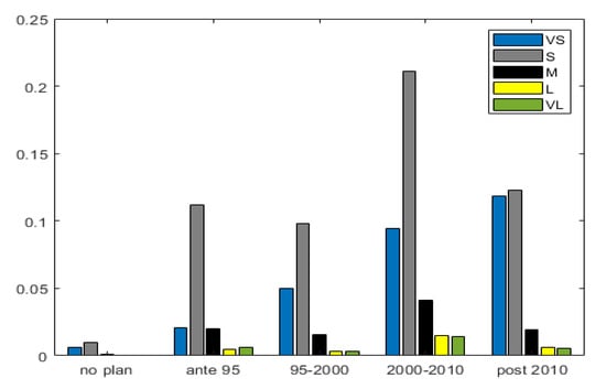 Available data [42] show that the municipalities that tend to plan more frequently are those in the S+VS group: 53% of the plans updated after 2000 (covering a third of the national territory and 37% of inhabitants) can be ascribed to this category, compared to about 4% in the L+VL group (20% of territory and 24% of inhabitants). Even if we look back to the last decade (after 2010), we see that 11% of national territory is planned by the same group of S+VS municipalities, which is double the planning areas managed by the L+VL group (5%) (Figure 5). This is probably due to the fewer difficulties in planning approaches and in community-wide and participatory dialogue that, on average, are found in smaller municipalities with a limited number of inhabitants. In these cases, large economic and entrepreneurial interests, pressure to transform land and lobbying actions against local governments are statistically more moderate. Consequently, a significant part of Italian territory, just under half, is planned with greater continuity by local governments that manage very small territories, corresponding, as mentioned above, to squares ranging between 3 and 8 km per side.