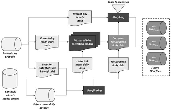 Multiple public and private organizations are involved in developing and updating EPW files, a few of which are open to users. The development of an EPW file requires historical weather datasets [21]. Each historical year of a location may contain extreme events that are rarely observed for the site. These extreme events should not influence assessments of the energy performance of buildings or mislead the building designers into oversizing or undersizing the energy conservation measures. Thus, typical weather files are usually developed by using Finkelstein–Schafer (FS) statistics, which represent the near climatic conditions of a location [22]. There are two approaches available when creating a typical weather file. The USA’s first approach is called the test reference year [23]. In this approach, the FS statistics extract a single year from historic weather datasets containing the least severe events. On the other hand, the typical meteorological year is also constructed by using FS statistics [24]. It filters each representative month from a historical dataset and then concatenates them into a single year. Manuel Herrera et al. (2017) [25] reviewed existing approaches to the construction of present-day and future weather files. Hosseini et al. (2020) [26] developed a systematic approach to the creation of typical meteorological year weather files by using machine learning (ML) for clustering instead of FS statistics. Three future weather file generators are commonly referred to for the assessment of the impacts of climate change on the built environment. The Meteonorm future weather file generator produces future weather files for scenarios of the third assessment report (TAR) by using a climate data repository and stochastic weather generator [27]. The second tool is the CC World Weather File Generator, a Microsoft-Excel-based tool that generates future weather files based on the scenarios of the AR4 with the Hadley Center Coupled Model 3 (HadCM3). The WeatherShift TM is the third future weather file generator, and it was developed by ARUP and Argos Analytics to produce future weather files for the Representative Concentration Pathways 4.5 and 8.5 from the fourth assessment report (AR4) [28]. In the case of the Metenorm and the CC World Weather File Generator, the future files are only available for the scenarios from the TAR. Moreover, a study [29] revealed that the simulation results for a sample house model in a location with future weather files obtained from WeatherShift, Meteonorm, and CCWorldWeatherGen showed different results. AR4-scenario-based future weather files are available with WeatherShift, but only for RCP 4.5 and RCP 8.5. A future weather file generator that does not require a database and allows the user to choose any RCP scenario is required.